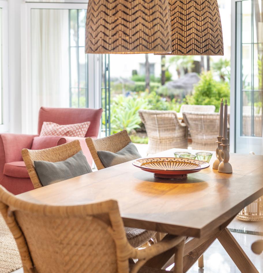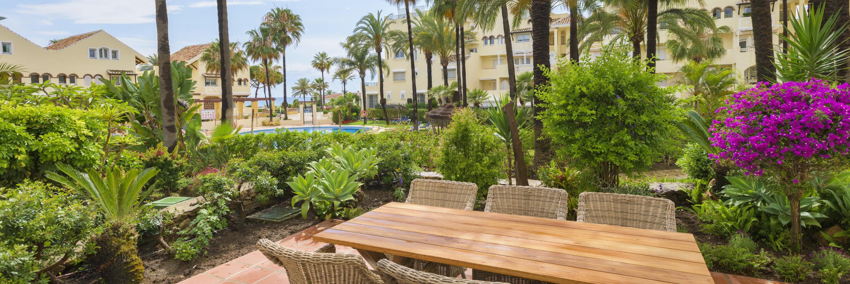 Härlig lägenhet med trädgård och direkt access till stranden. Här njuter man av livet.